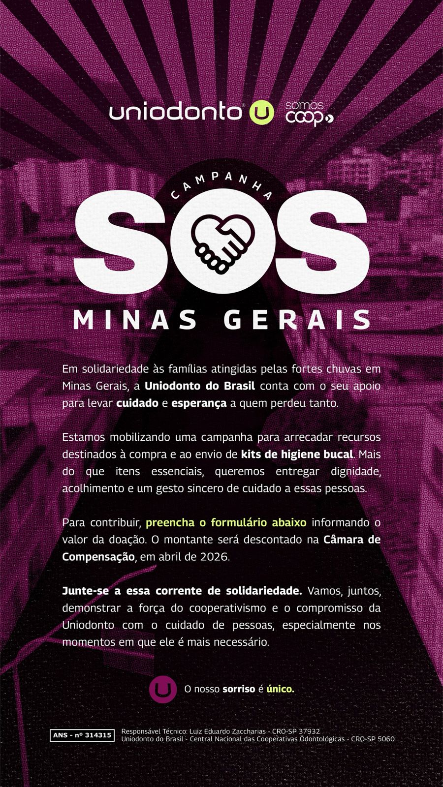 A campanha SOS Minas Gerais nasce do compromisso cooperativista de cuidar das pessoas para além da assistência odontológica. Mais do que doações materiais, a iniciativa busca levar acolhimento, dignidade e esperança a quem perdeu tanto em decorrência das enchentes.